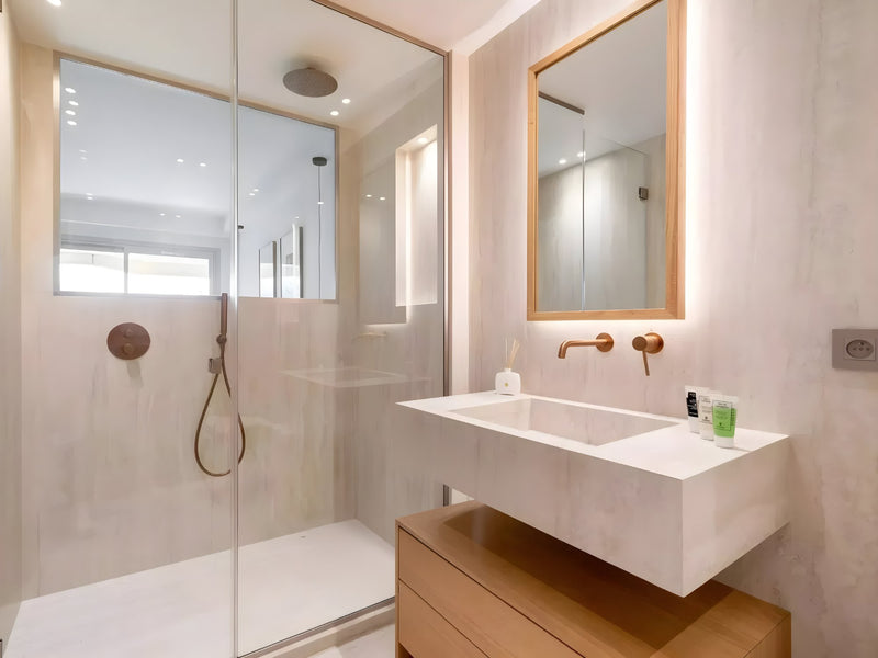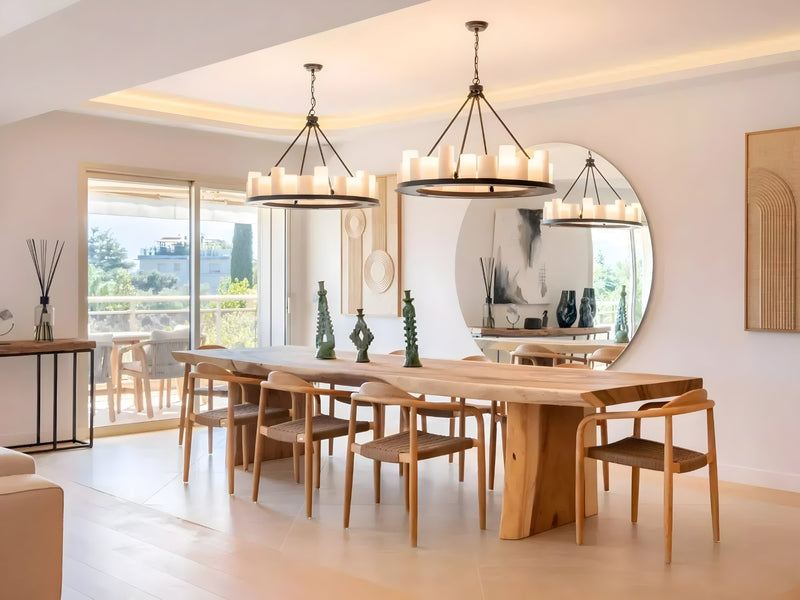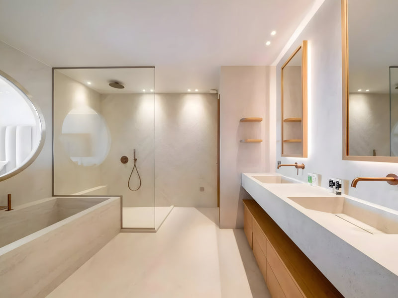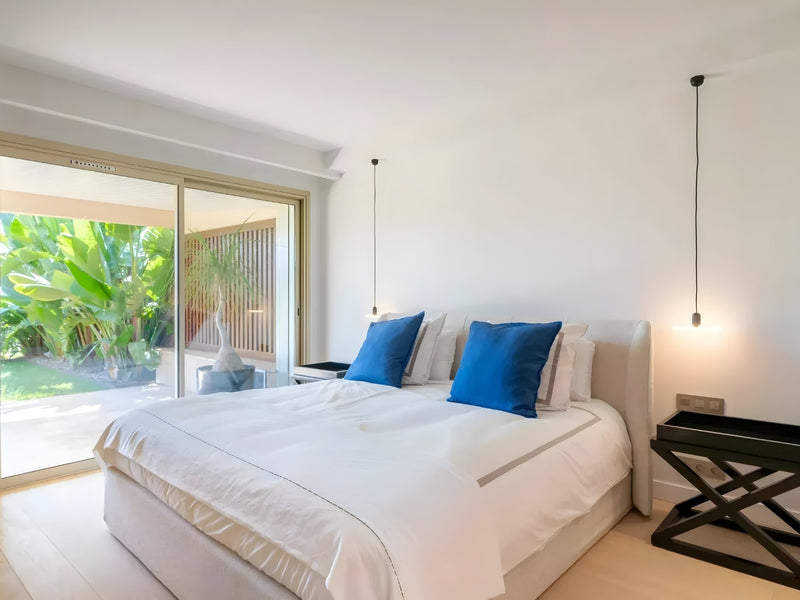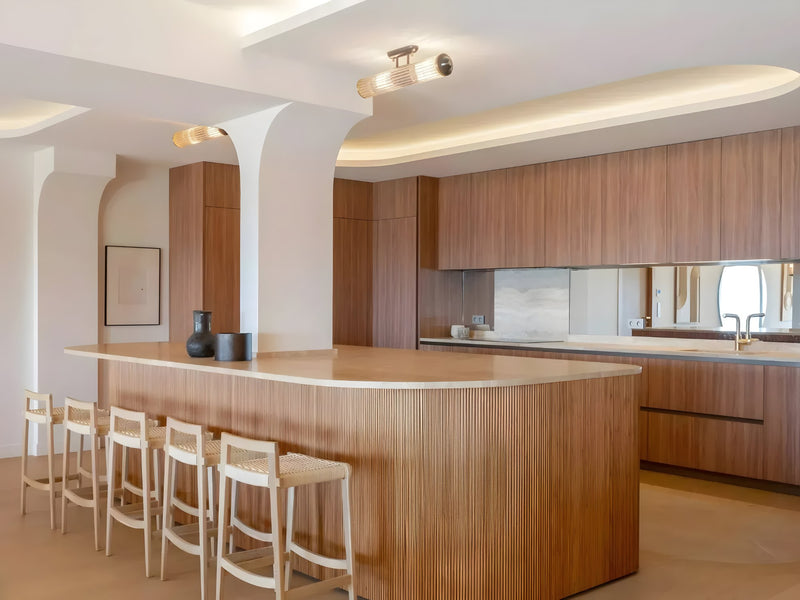 We curated every layer of decorative and architectural lighting: ceramic base table and glass wall lights add ambient sparkle in the lounge; candle-style chandeliers float above the dining table for an intimate, coastal-elegant mood; sleek ceiling industrial style modules illuminate the kitchen island; hidden LED strips and pinpoint spots create a spa-like glow in each en-suite bath; and pendant clusters lend soft, hotel-suite warmth to the bedrooms.