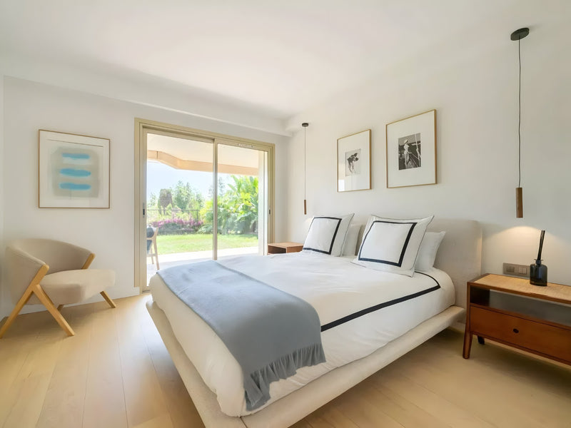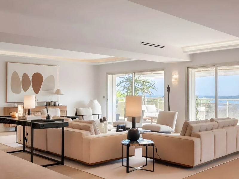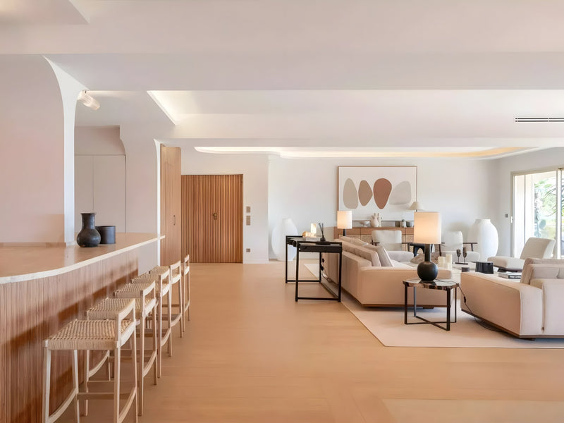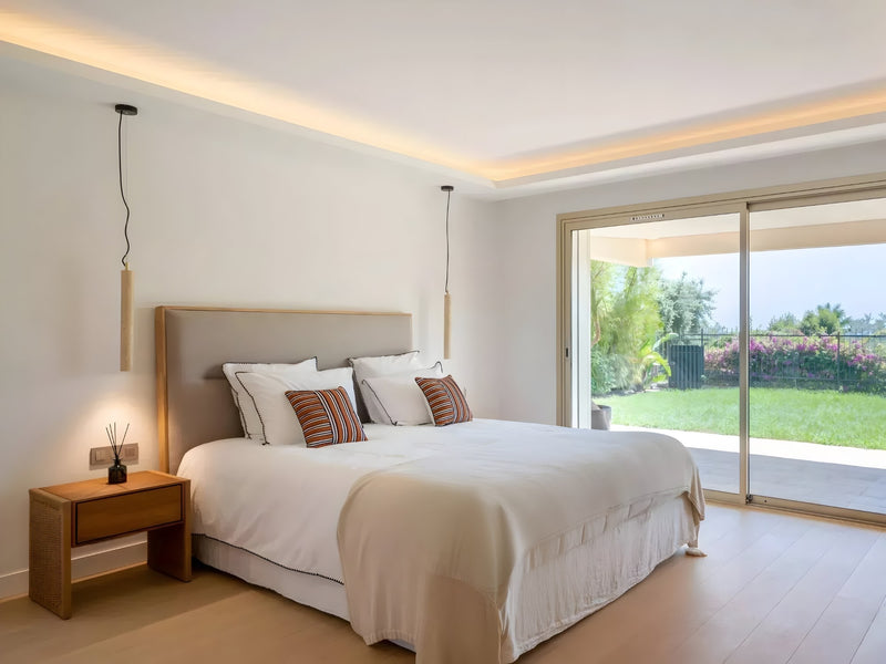 Perched in the coveted hills of Cannes Californie with sweeping Mediterranean views, this five-bedroom contemporary villa merges glass facades with warm interior textures.