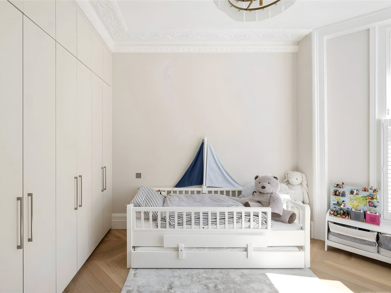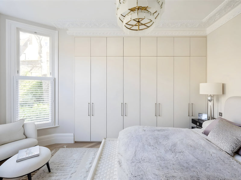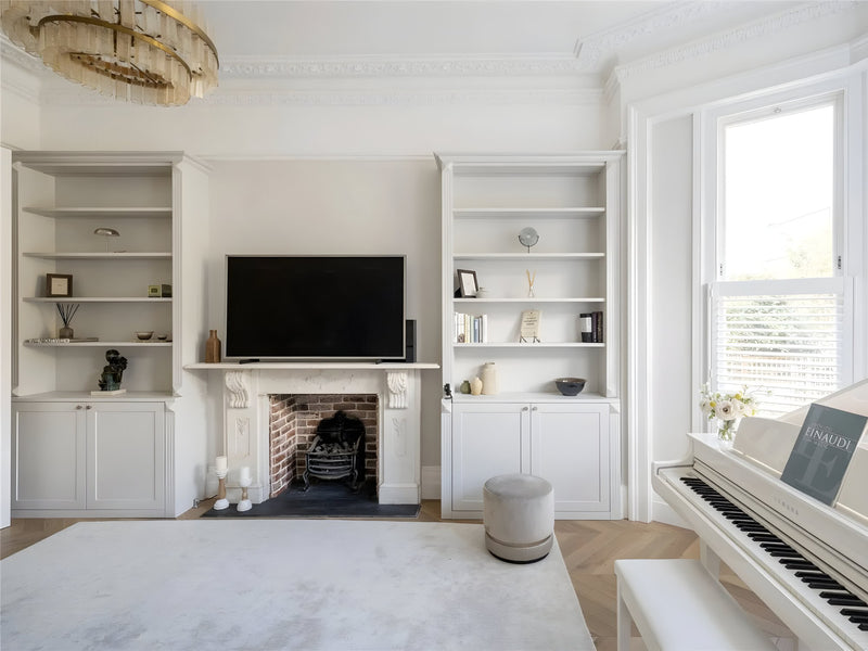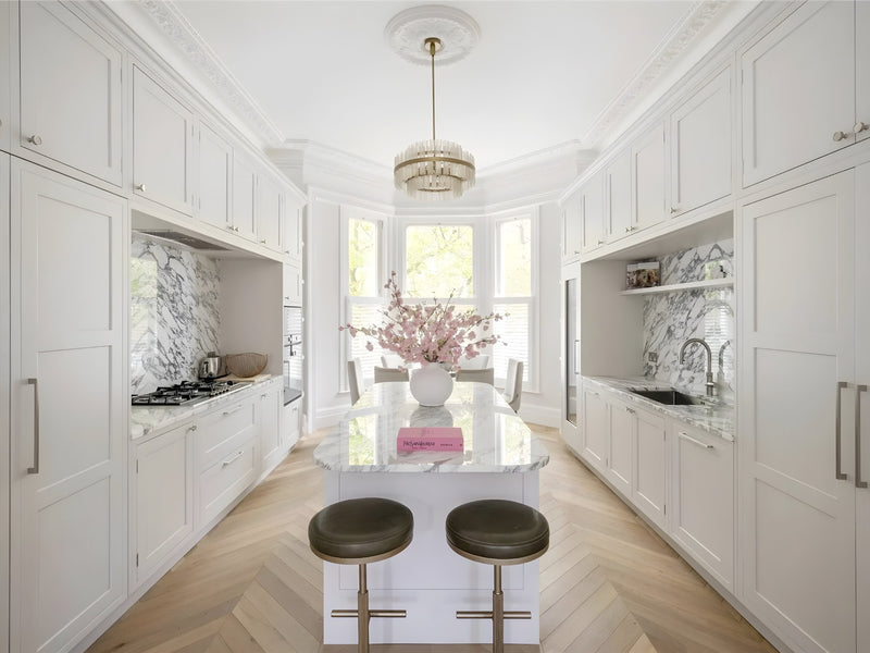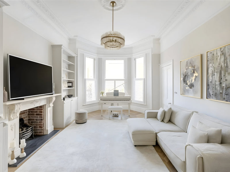 A quintessential Notting Hill apartment re-imagined with modern elegance. We supplied the full decorative and architectural lighting scheme: slender glass chandeliers highlight the marble kitchen island, low-glare recessed LEDs wash original cornicing, and dimmable wall lights add warmth to the sun-filled living room. Delivering a seamless blend of period charm and contemporary luxury.