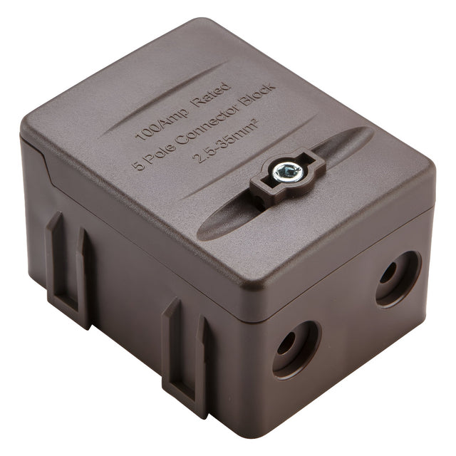 The 100A 5-Way SP Connector Block in brown provides secure, reliable connections for live circuits (L1). With a 230V AC rating and IP2XD protection, it ensures safety and durability. Designed to accept up to five 2.5–35mm² conductors, it features Allen key terminals for firm contact and a secure cover with wire locking. Its interlocking design allows multiple units to be joined for flexible installations. Shutters cover unused entries for added safety. Made from strong polycarbonate with top and bottom cable entries for convenience.