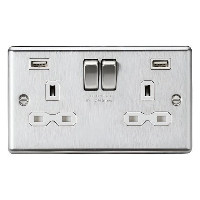 13A 2 Gang SP Switched Socket With Dual USB - Brushed Chrome With White Insert