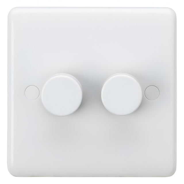 The 2 Gang 2-Way Intelligent Dimmer in white offers smooth, responsive lighting control within a refined rounded-edge design. Constructed from thermoset resin with anti-microbial protection, the 7mm contoured plate provides a clean, modern aesthetic. Supporting 5–400W (5–150W LED) loads, it includes both trailing-edge and leading-edge dimming modes for enhanced lamp compatibility. All trimming, mode switching, and reset functions are accessible from the front control knob, making setup and adjustments simple. The push-on/push-off rotary control delivers precise dimming and intuitive operation, while 2-way wiring enables multi-point control. IP20 rated and compatible with a 25mm mounting box, it’s ideal for modern homes, offices, and hospitality settings requiring elegant, efficient light management. Suitable for use with dimmable lamps only NB: Do not use in a mixed environment i.e. difference brands of lamps or different wattages of lamps in same fitting