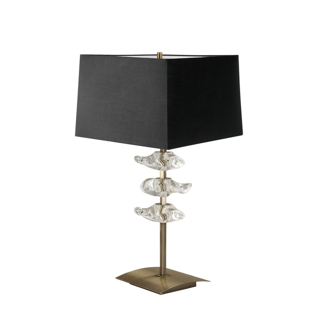 The Akira 2 Light Table Lamp in antique brass with black shades fuses timeless warmth with bold contemporary styling. Its two antique brass stems rise from a solid square base, supporting black fabric shades accented by clear faceted crystals. The crystals lend a refined sparkle that contrasts with the depth of the black shades, producing a soft ambient glow while maintaining visual sophistication. The antique brass brings a subtle richness and warmth, balancing the crisp silhouette of the twin shades. This combination creates a versatile statement piece ideal for living rooms, dining areas, or bedrooms, where it adds a layer of luxurious detail without overpowering the space. The dual-level composition enhances visual symmetry and height, making it perfect for anchoring end tables or dressing tables. Its classic metallic tone and modern structure allow it to blend seamlessly into both traditional and transitional interiors, offering a lighting solution that is both functional and decorative. This lamp elevates interiors with its harmony of elegant materials and contemporary form.