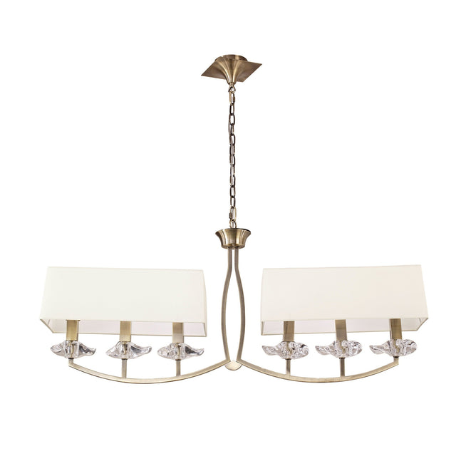 The Akira 6 Light 2 Arm Crystal Chandelier in brass with cream shades showcases refined proportion and timeless design. Its twin-arm frame extends 1040mm in width, maintaining a precise balance between structure and ornament. Each of the six crystal glass cups glows with warm illumination, enhanced by the soft cream shades above. The brass finish adds classic warmth, grounding the chandelier’s contemporary form in traditional elegance. Light flows through the clear glass and reflects gently off the metallic surface, creating layered illumination that enhances atmosphere and dimension. Every curve, joint, and alignment in Akira’s framework has been engineered for perfect symmetry. Its design embodies restraint and beauty, crafted for interiors that value refined form and understated luxury. Ideal for dining rooms or elongated spaces, this chandelier’s architectural composition offers enduring sophistication.