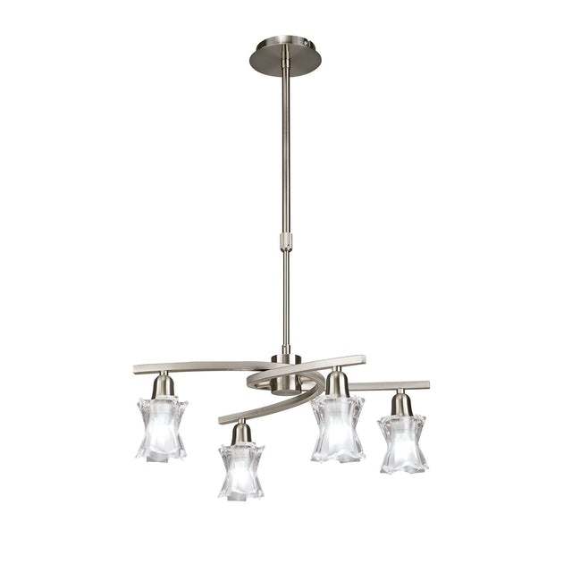 The Alaska 4 Light Chandelier in satin nickel embodies pure minimalism through structural precision. With a 490mm frame, it houses four glass shades crafted with angular facets that combine frosted diffusion and clear edges for a distinctive luminous texture. The satin nickel finish reinforces the minimalist aesthetic, adding a refined metallic softness that harmonizes with the clarity of the glass. Compact yet expressive, it transitions smoothly between chandelier and semi-flush installations, making it ideal for smaller living or dining spaces. The proportional spacing of the shades ensures even light coverage while preserving the fixture’s architectural integrity. Alaska’s design reflects a philosophy of reduction - every detail serves form, balance, and illumination. CFL Lamps Included.