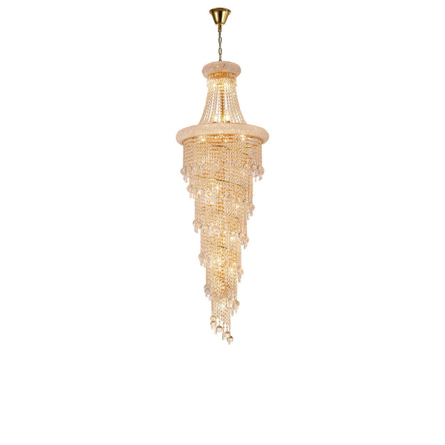 The Alexandra 60cm 4 Layer Spiral 25 Light Crystal Chandelier in Gold encapsulates the grandeur of spiral lighting in a smaller, warmer expression. Its four concentric tiers descend in an elegant spiral, forming a unified composition of crystal brilliance and golden radiance. The gold-finished frame accentuates the clarity of the crystal strands, creating an interplay of warm tones and refracted light. With 25 bulbs distributed evenly across the structure, the chandelier produces a luminous harmony that elevates its architectural form. The descending design maintains visual balance, transforming light into a cascading sculptural presence. Each crystal element is precision-cut to ensure clarity and symmetry, resulting in a continuous, fluid pattern of reflection. The compact scale and golden finish make it perfect for intimate yet sophisticated interiors. Alexandra in gold is a testament to craftsmanship and proportion - an object that translates grandeur into accessible, luminous refinement.