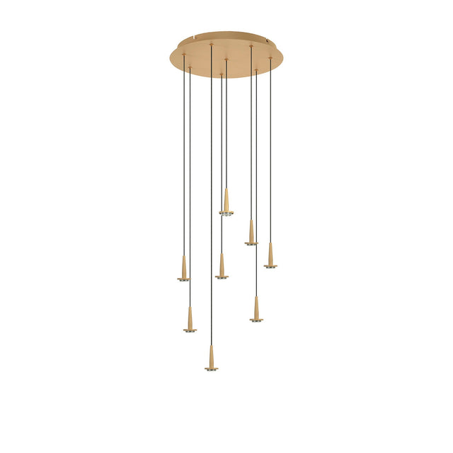 The Andromeda 8 Light LED Glass Cluster Pendant Light Frame in Light Gold offers a sophisticated foundation for creating custom lighting compositions on a more compact scale. This frame-only design accommodates up to eight glass pendants from the Andromeda collection, allowing combinations of tones such as copper, chrome, amber, or clear to be arranged to individual preference. The light gold circular canopy adds warmth and refinement, pairing effortlessly with both contemporary and transitional interiors. Integrated 3000K LEDs emit a soft, ambient glow that highlights the surrounding space while maintaining visual comfort. Adjustable suspension cables allow height customization, making it ideal for smaller dining areas, lounges, or hallways. Every detail is crafted for balance and proportion, ensuring a clean, architectural presence. This frame’s minimalist aesthetic provides the versatility to evolve with interior updates, serving as both a structural and decorative centerpiece. The Andromeda 8 Light Frame embodies refined adaptability, enabling lighting designs that reflect personal taste and timeless style.
