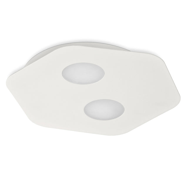 Within each polygon, a recessed diffused centre introduces a gentle lighting effect that radiates smoothly outward, emphasising the soft bevelled edges. The contrast between the planar surfaces and the lowered centre points lends depth, making the fixture feel layered despite its minimal footprint. The geometry remains controlled and clear, with crisp angles softened by the satin-like finish. The pairing of two modules creates balance, giving the design a calm, contemporary presence that blends geometric rigor with visual warmth.