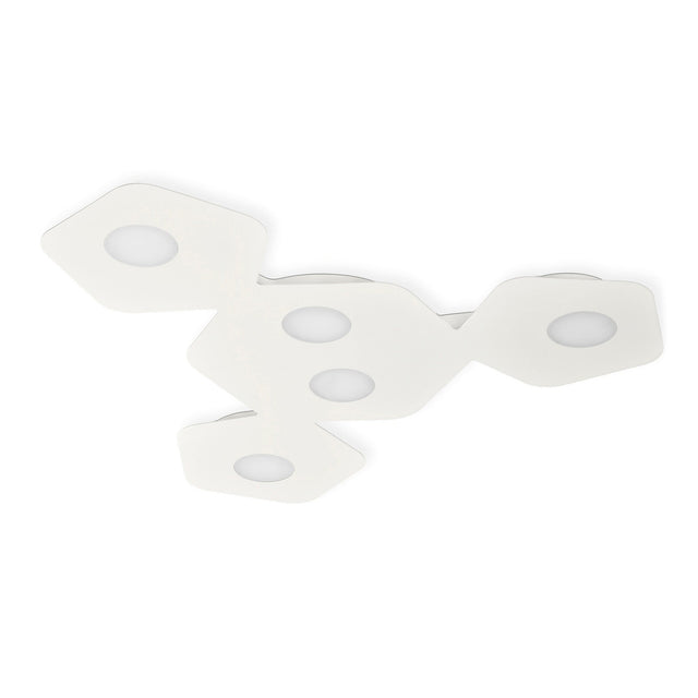 Area 5 Light Flush Ceiling Light – Sand White is defined by its beautifully irregular composition, formed from a cluster of polygonal shapes arranged with deliberate asymmetry. Each element varies slightly in size, creating a rhythmic structure that feels organic while remaining architecturally precise. The sand white finish softens the geometric edges, lending a tactile quality to the design and allowing the individual components to blend visually into a unified sculptural form. Subtle bevels around each polygon introduce shadow lines that add depth and dimension across the surface.