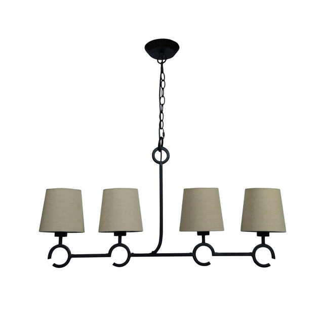The Argi 4 Light Chandelier translates geometric artistry into linear balance. Its brown oxide framework is composed of interwoven rectangular arcs that form an elongated, sculptural silhouette. Four taupe fabric shades sit evenly spaced along the structure, diffusing light through their woven texture to produce a warm, ambient glow. The minimalist linear design, measuring 880mm in width, is ideal for installation above dining tables or kitchen islands, where symmetry and proportion are key. Each metal curve is purposefully incomplete, creating visual rhythm and depth. Adjustable from 550mm to 1800mm, this chandelier combines structural craftsmanship with organic softness for a modern rustic interior.