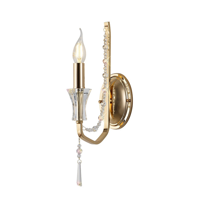The Armand 1 Light Crystal Wall Light – French Gold combines traditional luxury with refined crystal craftsmanship. Its single arm, finished in rich French gold, is draped with alternating clear crystal elements that glimmer beautifully when illuminated. A prominent crystal sconce anchors the design, while additional strands cascade gracefully, adding movement and sophistication. Ideal for intimate spaces such as hallways, bedrooms, or reading nooks, this modern wall light with classical influence delivers both ambient lighting and a touch of opulence. The French gold finish enhances its warm radiance, pairing perfectly with rich interiors, classic furniture, or warm-toned palettes. Designed for those who appreciate timeless glamour, the Armand Gold single-arm light elevates any room with elegant crystal brilliance.
