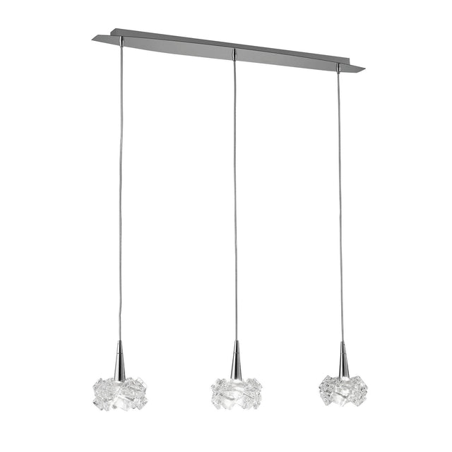 The Artic 3 Light Bar Pendant Light in Polished Chrome reveals precision in geometry and material clarity. Each pendant features a cube-like glass shade with a crystalline structure that refracts light across multiple planes. The interplay between glass and chrome produces a shimmering ice-like effect, scattering light into delicate prismatic patterns. The clean lines and polished surfaces evoke contemporary sophistication, while the angular design maintains architectural integrity. This pendant is ideal for kitchens, dining rooms, or commercial settings that demand ambient elegance with modern edge. The G9 fittings provide versatility, allowing customizable light output when paired with dimmable lamps. Artic’s design captures the purity of glass and the precision of chrome, presenting illumination that feels structured yet organic, sharp yet harmonious.