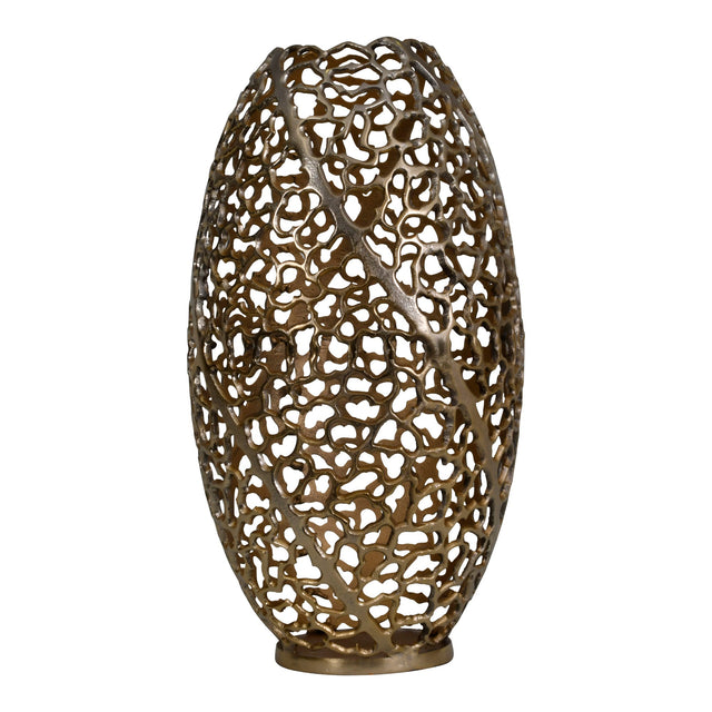 This decorative vase is created in cast aluminium, hand crafted in India, and reminiscent of subtropical coral reef. Standing at 48cm tall, this statement vase will look striking with tall stems or dried botanicals. The Aussie range has a golden finish, and extends to a Ellipse Bowl. Please note this item is not food safe and is suitable for decorative use only.