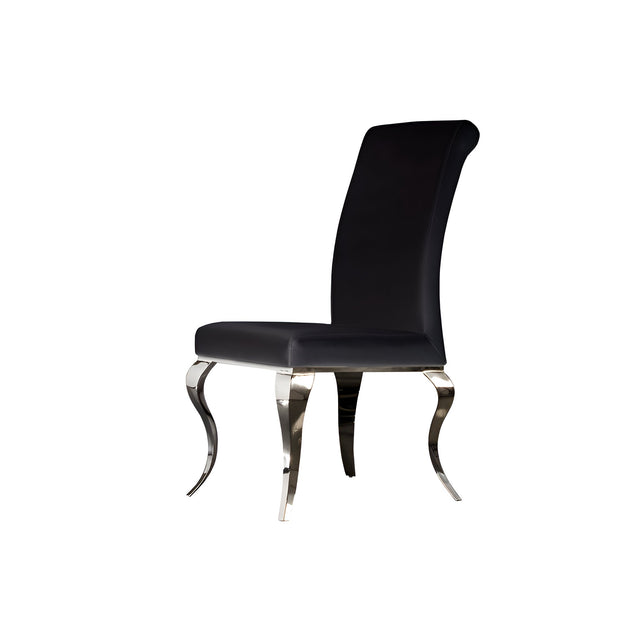 Polished stainless steel legs with a cabriole curve bring sculptural elegance, while the contoured backrest supports upright dining posture. The black and chrome contrast adds dramatic flair to both traditional and contemporary table settings.