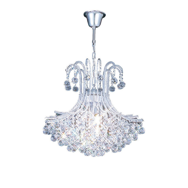 The Bask 64cm Round 6 Light Crystal Chandelier in polished chrome incorporates a circular tiered frame structure densely filled with precision-cut crystal drops. The frame consists of concentric rings arranged vertically to create a continuous cylindrical profile. Crystals are suspended in close formation, producing uniform light dispersion and controlled refraction from six light points concealed within the structure. The polished chrome surface provides mirror-grade reflectivity, amplifying the brightness produced by the crystal arrangement. Measuring 640mm in diameter, it is supported by a short adjustable chain and canopy that retain the same metallic finish for visual continuity. The layered arrangement of crystal strands maintains consistent spacing, ensuring optical precision and even distribution of luminance. The fixture achieves mechanical stability through internal support rods and reinforced connection points between tiers. Designed for modern or formal interiors, the chandelier delivers structured illumination and distinct vertical symmetry.