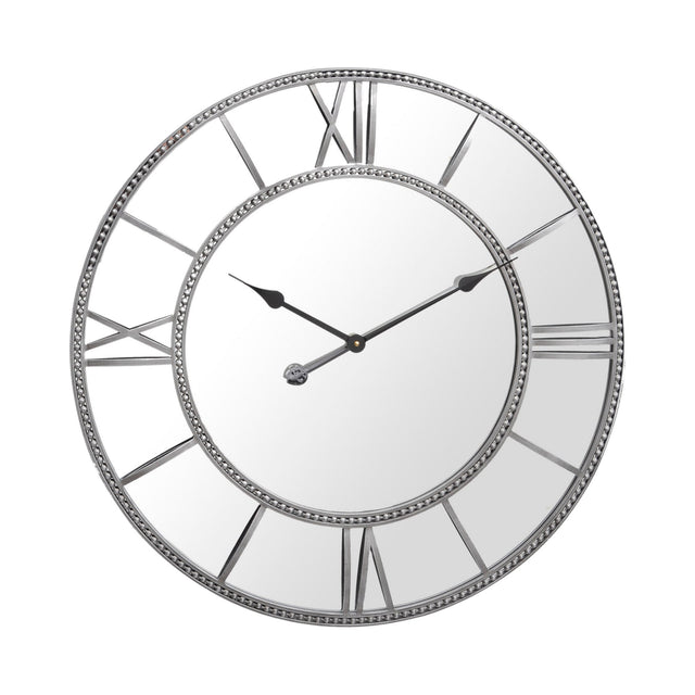 The Beaded Mirrored Round Wall Clock in Grey is a refined wall clock that blends vintage charm with modern elegance. Crafted from iron with a distressed grey finish, it features a curved beaded frame that adds texture and depth. The mirrored clock face enhances light and adds a touch of sophistication, making it a striking focal point in any room. Measuring 70 cm in diameter and 4 cm in depth, this clock is ideally sized for living rooms, hallways, or bedrooms. It operates on a single AA battery (not included) and requires no assembly, ensuring easy installation. Whether your decor is vintage, French country, or transitional, this clock complements a wide range of interior styles.