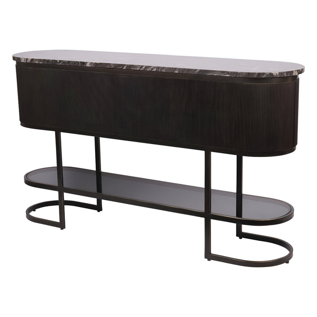 The Belvedere Aged Black Console Table exemplifies contemporary, space-saving design. This elegant console features a smooth gilded dark bronze frame, black tinted glass, and beautiful Markino Marble. It has a glass shelf with a clearance height of 25cm. The natural materials used ensure that each piece is unique and gold is used in highlights to contrast against the black tones. Marble tops will feature individual veining patterns and varied colour hues, while the iron bases may have slight texture variations. These characteristics enhance the charm and individuality of your furniture, guaranteeing that no two products are exactly alike. The Belvedere Aged Black range also includes a side table and a console. Additionally, a larger collection is available in Aged Gold.