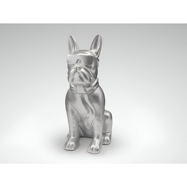 Silver outdoor bulldog sculpture designed to reflect both light and personality, this oversized French bulldog figure delivers maximum visual impact. Constructed from fiberglass and polyester for weather resistance, it’s finished in reflective silver paint - offering a high-contrast metallic sheen that stands out against both natural and architectural surroundings.