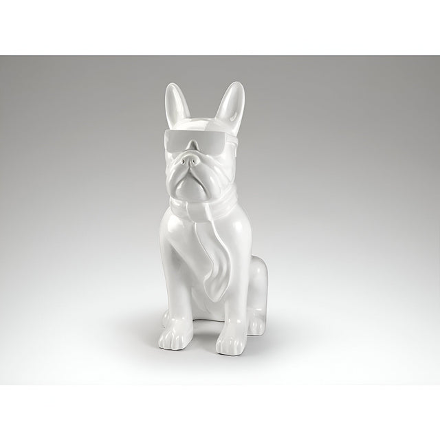 White outdoor bulldog sculpture with a commanding stance and designer scale, this French bulldog figure is crafted from fiberglass and polyester for outdoor durability. The glossy white paint finish adds brightness and polish to garden spaces, patio settings, or hospitality exteriors - bringing sculptural charm and contemporary edge to open-air environments.