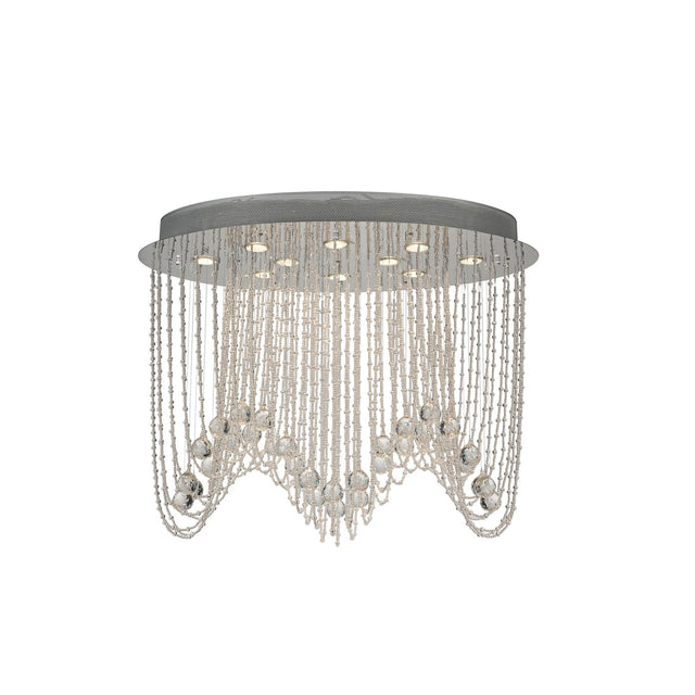 Camilla 10 Light Crystal Semi Flush Ceiling Light is a semi flush ceiling light that showcases a contemporary design built around intricate crystal artistry and polished chrome refinement. The fixture presents a sweeping arrangement of crystal beaded strands, each composed of alternating bead sizes that create visually rich patterns. These strands are attached from both sides of the polished chrome frame, forming the collection’s signature waved tunnel effect. This unique geometry introduces architectural detail and sculptural form suitable for living rooms, dining areas, bedrooms, lounges, and transitional spaces.