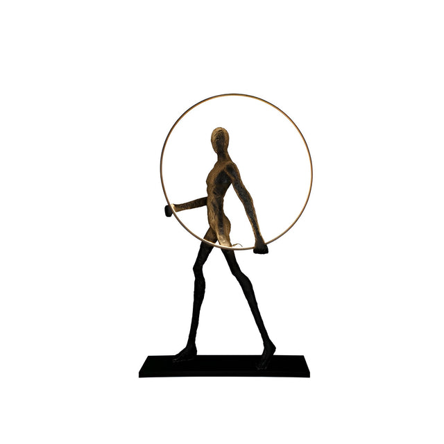 Black LED sculpture meets kinetic form in this dynamic interpretation of movement and modernity. This fiberglass and polyester resin figure features a matte black finish, standing with confident stride while encircled by a luminous metal LED ring. Designed to capture the energy of motion, this piece radiates sculptural rhythm and visual clarity.