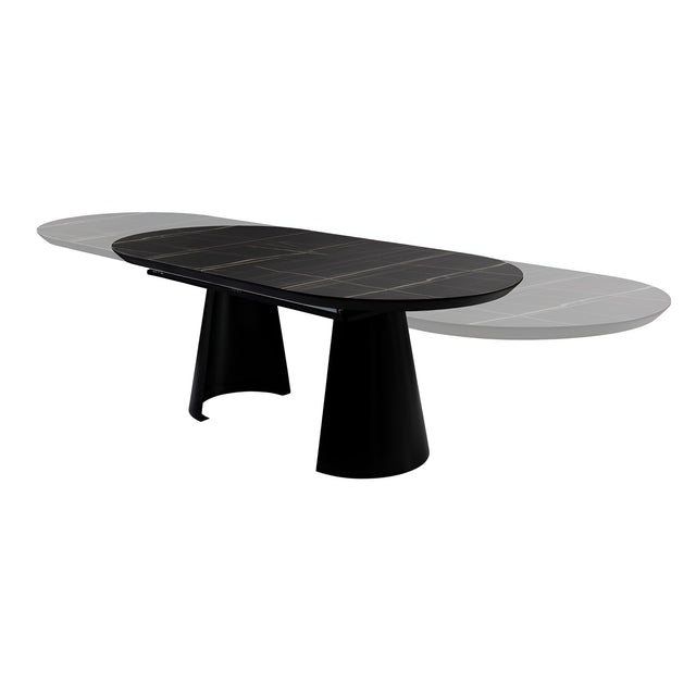 Designed for high-capacity entertaining with uncompromising style, the Capri Extendable Dining Table in Black Marble brings architectural strength to modern interiors. Constructed from metal with a bold matte black finish, its base anchors the table visually while providing structural integrity. The top, crafted from MDF, features a glossy black marble finish that offers dramatic contrast and polish. Treated with a highly resistant melamine surface, it resists daily wear while maintaining a refined aesthetic.