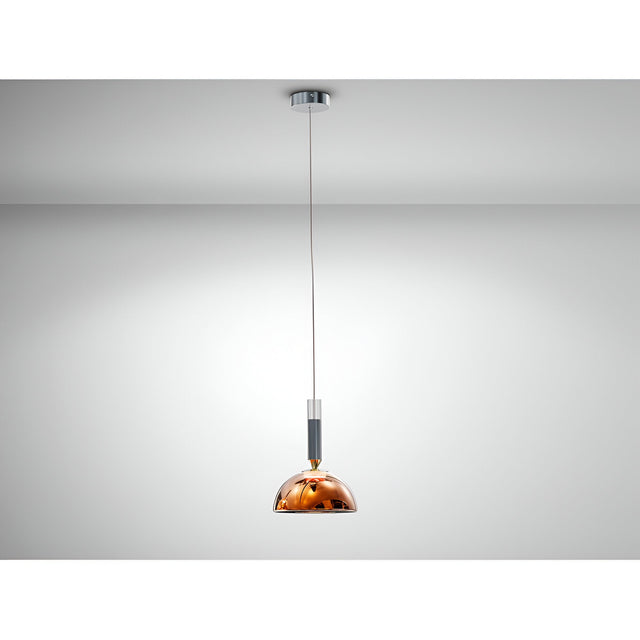 Charlize LED Pendant in copper introduces a subtle metallic depth to any interior. Finished in a rich dark grey brushed aluminium, the fixture features a shimmered glass shade enhanced with an internal copper-toned electrolyzed plate. The result is a soft interplay of warm and cool tones, ideal for spaces that embrace earthy palettes, textured finishes, or natural materials.