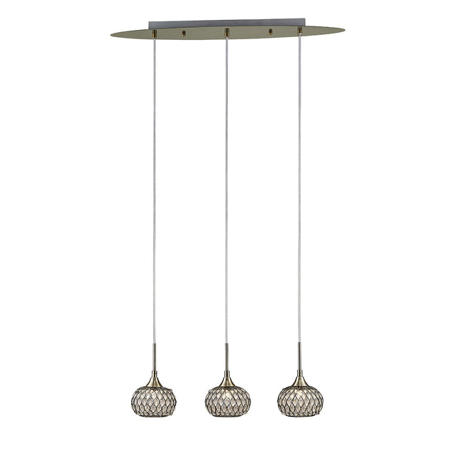 The Chelsie 3 Light Beaded Glass Bar Pendant Light in Antique Brass unites traditional warmth with modern structure. Each shade is encased in a clear glass sphere framed by a refined lattice of antique brass, offering a tactile sense of craftsmanship. The metal’s soft golden undertone enriches the illumination, lending depth and texture to interiors. Light filters through the intricate beading, scattering subtle patterns across walls and ceilings. The balance of clear transparency and warm metallic finish brings sophistication and comfort to the composition. Designed for both contemporary and classic spaces, Chelsie’s linear form ensures even light distribution while preserving visual delicacy. The antique brass finish’s brushed texture adds an artisanal quality, reflecting craftsmanship rooted in detail and refinement.