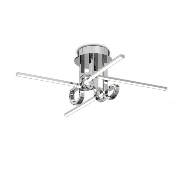 Cinto Semi-Flush Ceiling Light 28W 3000K – Polished Chrome presents an expressive composition of looping metal forms arranged around a compact central stem. The polished chrome finish introduces a cool reflective sheen that enhances the flowing curvature of each arm. These linked arcs create an intricate open structure, giving the piece a sculptural quality from every angle. The linear LED elements are neatly integrated within the slim contours, allowing the light to follow the geometry naturally and highlight the fluid motion of the design.