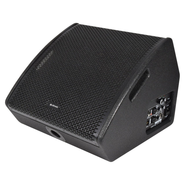 Modern wedge speaker performance meets professional design in the Citronic CM12A active monitor. Housed in a durable, texture-coated wooden cabinet with a compact footprint, this high-power class-D speaker delivers exceptional low-end clarity through dual bass ports and a concentric titanium compression driver for crisp highs. A powder-coated steel grille ensures rugged protection during live use, while the 35mm pole mount and M8 flying points offer versatile positioning.