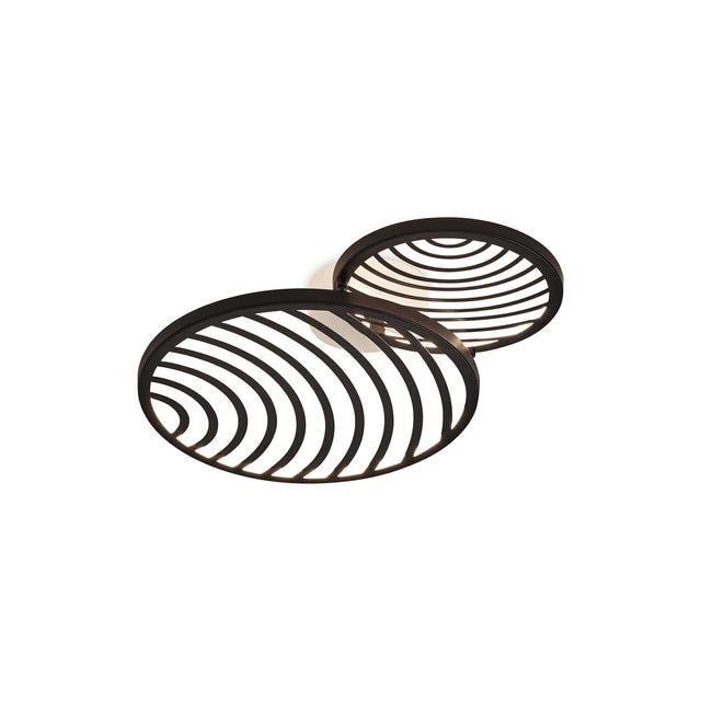 The Collage 2 Ring LED Semi-Flush Ceiling Light 30W 3000K in black presents a concise structural composition formed from two interlocking circular elements. The rings are shaped with a radial grille pattern that adds fluidity to the dark surface while maintaining crisp definition. The black finish enhances the sculptural clarity of the piece, giving it a strong, modern silhouette.