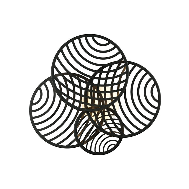 The Collage 4 Ring LED Semi-Flush Ceiling Light 60W 3000K in black presents a bold geometric arrangement of four interconnected circular forms. Each ring is constructed with a radial grille pattern that adds delicate curvature and gives the dark surface a gentle sense of depth. The black finish enhances the graphic clarity of the outline, ensuring every curve stands out with refined precision.