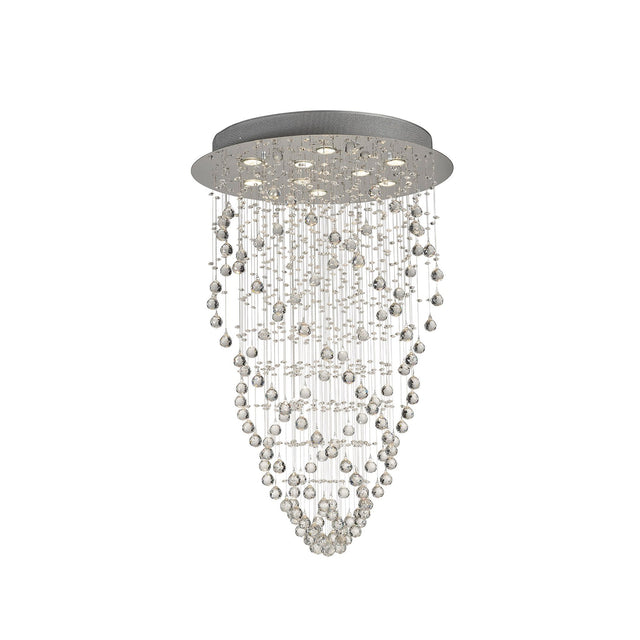 The Colorado 9 Light Cone Crystal Cluster Pendant Light in Polished Chrome epitomizes geometric balance and crystal clarity. Suspended from a circular chrome canopy, precision-cut crystal strands descend in a conical formation, forming a structured yet fluid silhouette. Each crystal facet captures light and reflects it in layered radiance, creating a harmonious interplay between brightness and shadow. The conical symmetry draws the eye upward, emphasizing architectural height and proportion. The polished chrome base adds contemporary sharpness while amplifying luminosity. Ideal for statement spaces, this pendant fuses classical crystal artistry with modern restraint. The Colorado cone variant transforms vertical light into sculpture, presenting brilliance through disciplined design.