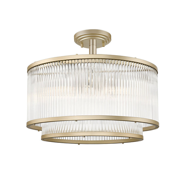 The Coral 5 Light 2-Tier Semi-Flush Light in matt gold offers a sculptural approach to close-to-ceiling home interior lighting. Designed with layered form and tonal richness in mind, this crystal-style fixture features two stacked drum frames trimmed in vertical glass rods. The satin brass finish adds warmth and dimension, making it ideal for interiors that lean into transitional elegance or contemporary calm.
