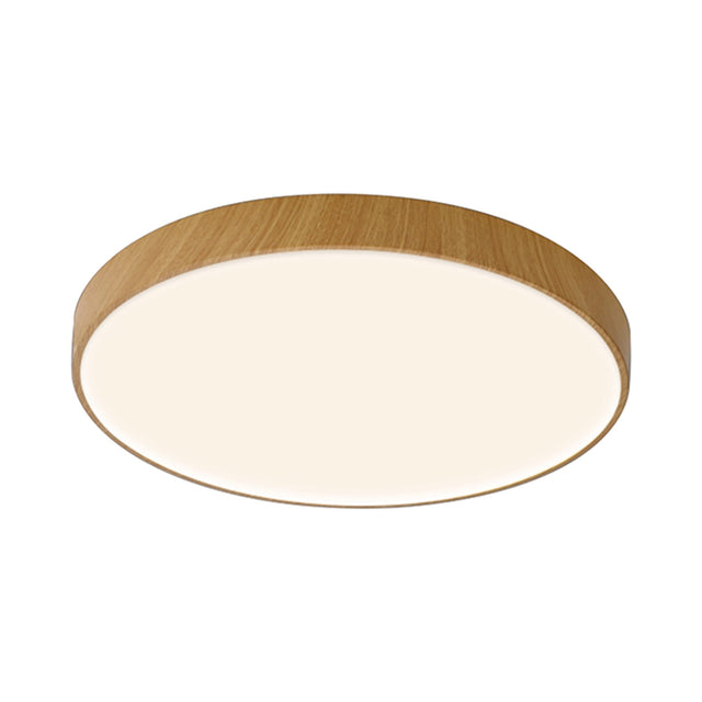 The Cumbuco II Round CCT LED Flush Ceiling Light 50W in light brown presents a refined circular design shaped by its smooth timber-effect band and softly illuminated acrylic diffuser. Its broad diameter gives the fixture a calm, expansive presence, while the slender height keeps the silhouette discreet and balanced. The warm light brown finish introduces a subtle natural character, contrasting gently with the opalescent surface of the diffuser to create a composition defined by clarity and simplicity. The circular frame encases the diffuser with precision, forming a clean border that enhances the purity of the geometry.