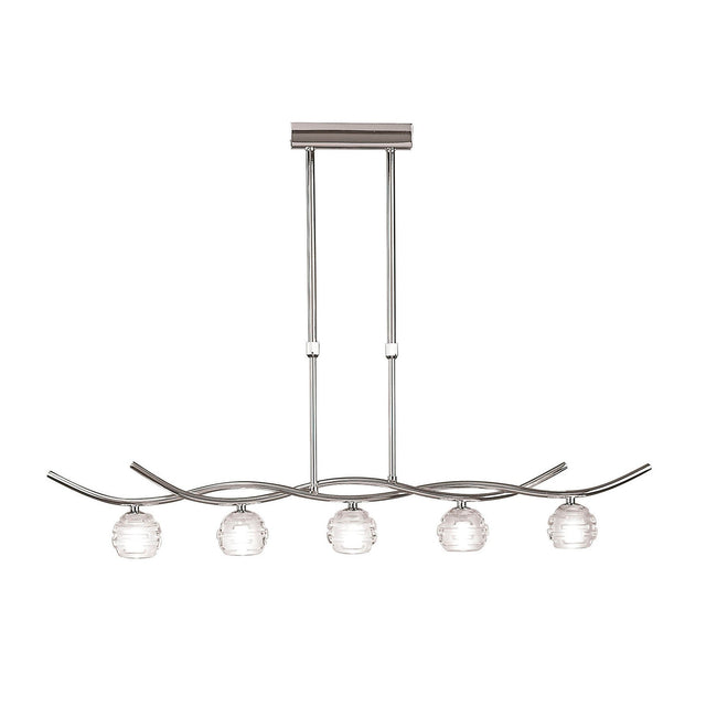 The Dali Telescopic 5 Light Suspension Light/Semi-Flush in polished chrome demonstrates the fusion of structural precision and artistic fluidity. Its five slender, curved arms radiate symmetrically from a central chrome column, supporting frosted and clear glass shades that diffuse light gracefully. Measuring 910mm in length, it projects an elegant linear composition ideal for dining areas and contemporary living spaces. The adjustable telescopic drop from 480mm to 710mm allows installation versatility across different ceiling heights. With five G9 lamps producing a combined 200W output, the fixture delivers even, warm illumination enhanced by the chrome’s reflective brilliance. The design’s continuous curvature and smooth geometry create dynamic presence, embodying understated luxury and technical artistry in a single composition.