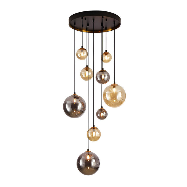 Dark 9-Light Black & Brass Cluster Pendant Light channels modern sophistication through nine smoked-glass spheres suspended from a matte-black canopy trimmed with satin-brass accents. The graduated globes - each finished in warm amber and moody grey - create a striking colour interplay that catches the eye from every angle, while the included G9 LED 4W bulbs infuse a cosy 3000K glow without harsh glare. Adjustable drops allow tight, sculptural clustering or an airy vertical cascade above dining tables, stairwells and lounge corners.