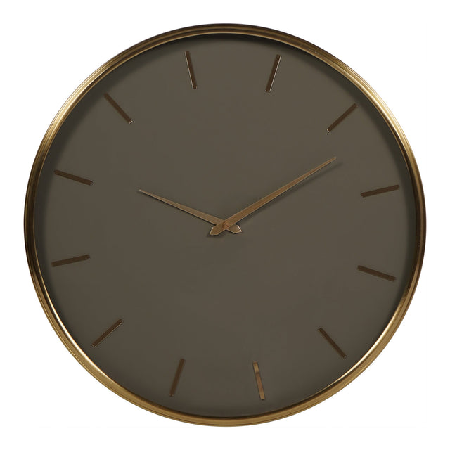 Our Green Dial Wall Clock, where minimalist design meets elegant sophistication. This exquisite timepiece showcases a deep, classic black background, beautifully contrasted by the delicate sheen of brass hands. Encircling the face, a smooth brass finish adds a touch of refined luxury, harmoniously balancing simplicity with opulence. Enhanced by a crystal-clear glass cover. 51 x 5 x 51 (WxDxH cm) Requires AA1 Battery (Battery not included) Please note that this clock produces a gentle ticking sound, adding to its nostalgic charm.