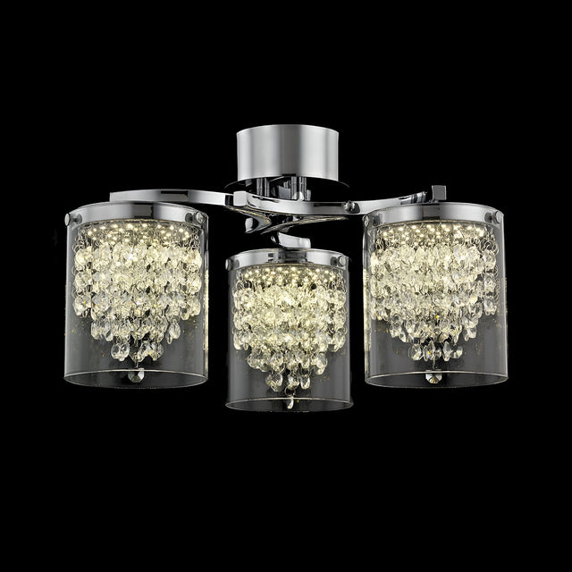 The Floren 3 LED Semi-Flush fixture in chrome brings a refined, contemporary edge to ceiling-mounted lighting. Featuring a trio of cylindrical glass shades, each embedded with strands of faceted crystal-effect drops, this design delivers both structure and elegance. The polished chrome body complements the transparent black-tinted glass, adding visual contrast that suits refined interiors with architectural detail or minimalist palettes. This semi-flush style is ideal for lower ceilings where pendant options may be impractical, making it a smart solution for compact dining spaces, living rooms, or foyers.