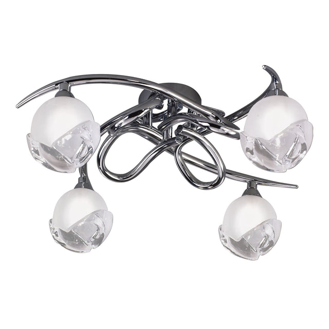 Fragma 4 Light Semi-Flush Ceiling Light – Polished Chrome is a refined decorative fixture that showcases the signature sweeping curves and expressive loops that define the collection. The polished chrome arms intertwine gracefully around a central base, creating a fluid arrangement that appears hand-drawn in metal. This sculptural structure supports four individually crafted sphere shades with a blend of clear glass and frosted detailing, producing a softened, elegant glow.