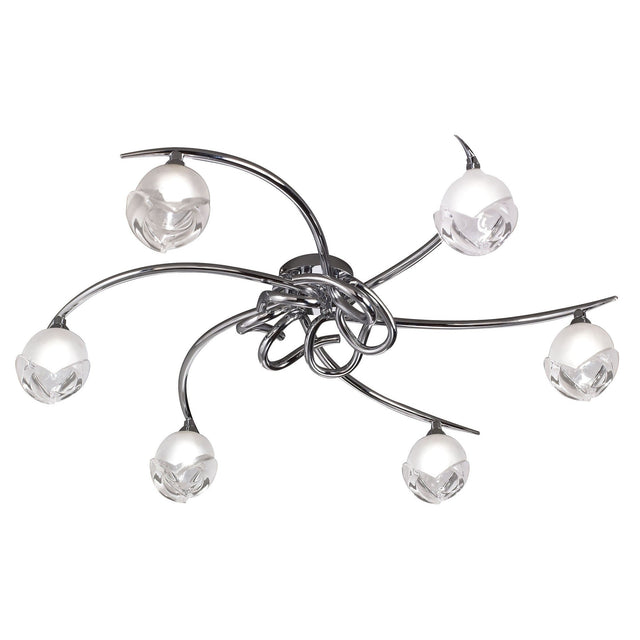 Fragma 6 Light Semi-Flush Ceiling Light – Polished Chrome brings sculptural elegance to modern interiors with its signature arrangement of fluid metalwork and distinctive glass spheres. The design centres around sweeping chrome arms that twist and loop with deliberate artistry, creating an impression of motion even while still. Each arm ends in a beautifully crafted sphere shade that features a combination of clear and frosted texturing, allowing the light to diffuse gently while maintaining crisp highlights. The frost-accented reserves provide a subtle contrast within the glass, enhancing the decorative detail and making each shade feel individually designed rather than mass produced.