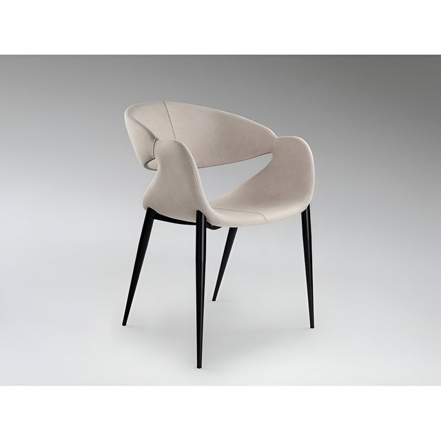 The Giro Dining Chair in white is a bold blend of sculptural form and everyday function. With sleek black metal legs in a matte finish, this chair grounds its soft, organic curves in minimalist structure. The seat and back are crafted from durable plywood layered with supportive foam, creating a contoured profile that offers both visual interest and ergonomic comfort. Upholstered in a refined light stone polyester textile, it showcases subtle decorative stitching that enhances its tailored look.