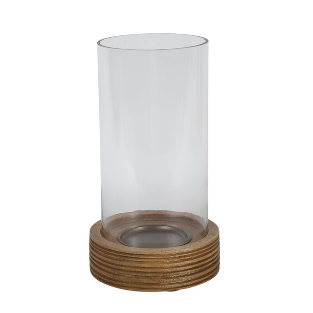 Add a touch of natural elegance to your space with our Glass & Wood Hurricane Candle Holder. Featuring a sleek, clear glass cylinder set atop a distinctive wooden base with sculpted, layered ridges, this piece blends simplicity and texture. The wooden base's stacked, grooved design adds depth and visual interest, contrasting beautifully with the smooth glass to create a balanced aesthetic. Perfect for a pillar candle, it offers a warm, inviting glow for any room. Perfectly paired with our 7テ・19 Pillar Candles.