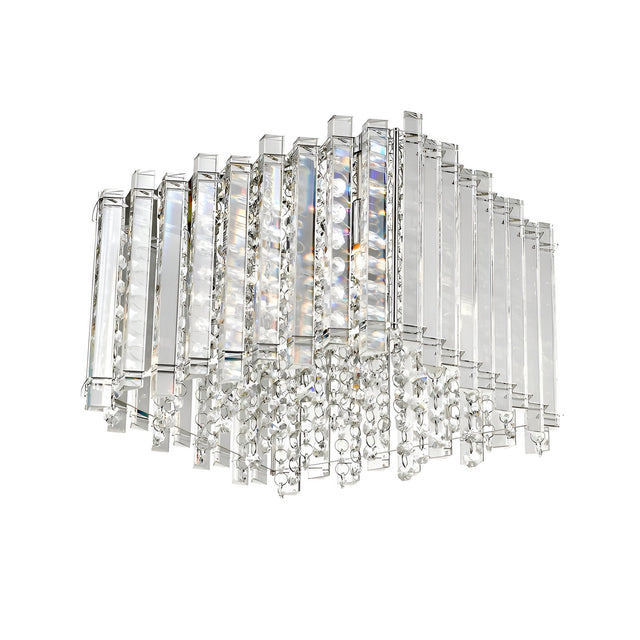 Glint 4 Light Clear Crystal Flush Light in Chrome transforms ceilings with its prismatic frame and cascading geometry. Designed as a compact ceiling piece, it delivers a high-impact surface profile that suits bedrooms, living rooms, or formal entryways. The tiered clear crystal prisms refract ambient light with striking clarity, offering both brightness and shadow play.