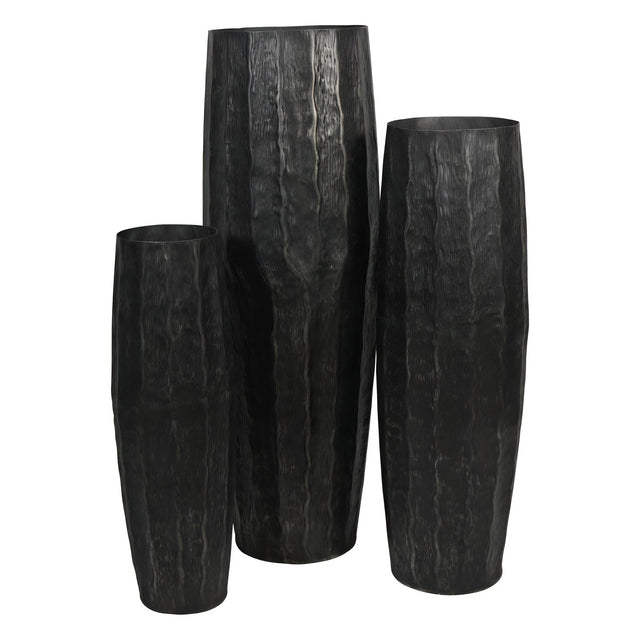 Hammered metal oversized planters in an antique pewter finish, made using traditional metalworking techniques. They have unique texture, shape and can be used as bold centrepieces, or create stunning backdrops. Sold as a set of 3. Decorative use only. Large 36 x 36 x 120 Medium 27 x 27 x 100 Small 20 x 20 x 80 ( WxDxH cm ) Please note this item is not food safe and is suitable for decorative use only.
