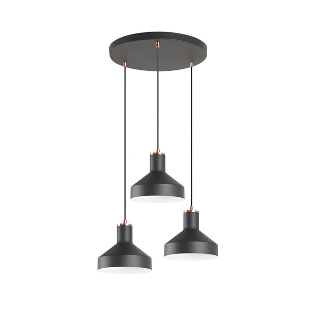 Irias is a black and copper cluster pendant light that channels café-style charm into contemporary living. Three metal shades in matte black taper to satin-copper collars, creating a two-tone contrast that feels both artisanal and timeless. Suspended from a round, low-profile canopy, the trio forms a compact statement ceiling light ideal for kitchen islands, home offices or cosy dining alcoves.