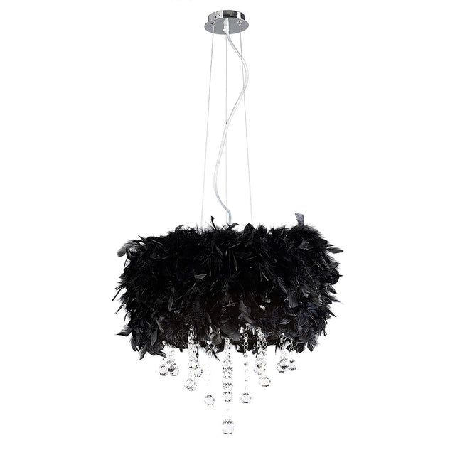 The Ibis 35cm 3 Light Chandelier in black offers bold sophistication through contrast and precision. Featuring a polished chrome frame with crystal strands and spherical terminations, it delivers controlled brilliance and reflection. The black feather shade encircles the light source, producing a diffused glow that balances intensity with depth. Designed to function as a pendant or semi-flush fixture, it accommodates both modern and dramatic interiors. Three E14 sockets ensure adequate brightness while maintaining proportional harmony. The interplay between black feathers and reflective chrome introduces tactile and optical duality, structured yet soft, architectural yet atmospheric. Dimmable functionality enhances its adaptability across various lighting conditions. With its compact scale and striking presence, the Ibis Black Feather Chandelier defines itself as both sculpture and illumination, merging texture and precision in a single composition.