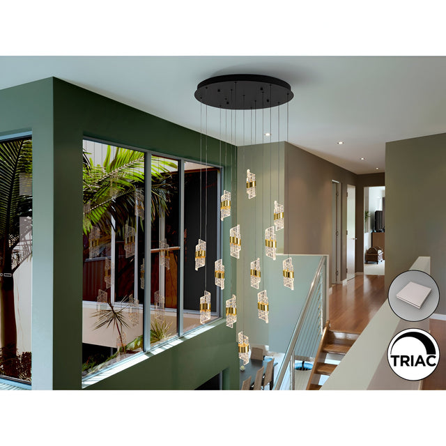 Integrated 3000K LEDs (91W total) deliver 8,370 lumens of warm ambience, and the supplied remote pairs with a TRIAC/0-10 V driver for smooth dimming straight out of the box. Gravity toggles lock the canopy flush, keeping lines crisp while you customise drop lengths into a tight corkscrew or an airy waterfall. By blending sculptural acrylic, contrasting black-and-gold metal, and energy-smart lighting, Iliada transforms vertical space into an illuminated art piece that elevates contemporary, Art Deco, or luxury interiors with luminous grace.