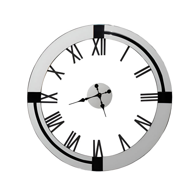 The Kairos Silver Wall Clock transforms a practical object into a commanding piece of wall decor. With its open-faced sphere design and bold use of mirrored and black lacquered materials, this clock is both timepiece and sculpture. The outer ring is composed of bevelled silver mirrors mounted onto a solid MDF base, with glossy black Roman numerals and central hour markers giving the piece sharp visual contrast. The absence of a background creates a striking floating effect, allowing your wall to become part of the clock's negative space.