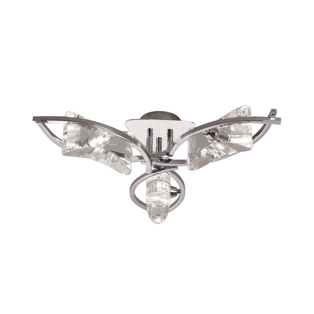 Kromo 3 Light Semi-Flush Ceiling Light – Polished Chrome delivers contemporary refinement through a trio of sculpted optical glass forms framed by bright, polished metalwork. Each glass block is carved with multifaceted surfaces that refract illumination into captivating patterns, offering a dynamic lighting experience that adds depth and interest to any room.